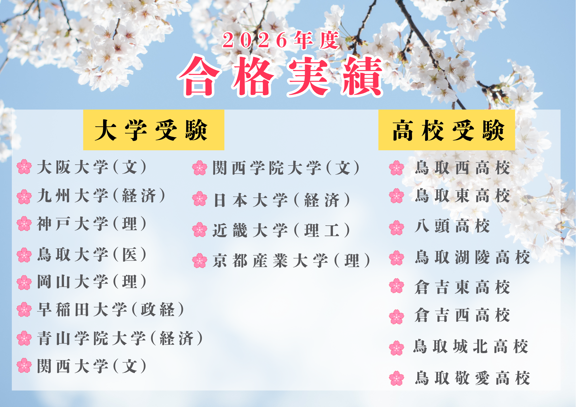 高校受験では、鳥取西高校・鳥取東高校をはじめとする県内の進学校に加え、県外の難関高校への合格実績も有しております。